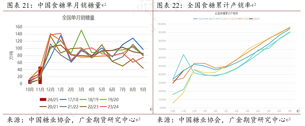 25年春节前备货热情尚可。随着元旦、春节来临,经销商补货采购陆续启动,有利于市场需求回升。11月份全国单月销售食糖49.28万吨,同比增加246%。24/25榨季截至11月底,全国累计销售食糖60.9万吨,同比增加29.22万吨,增幅92.23%;累计销糖率44.52%,同比加快8.78个百分点。