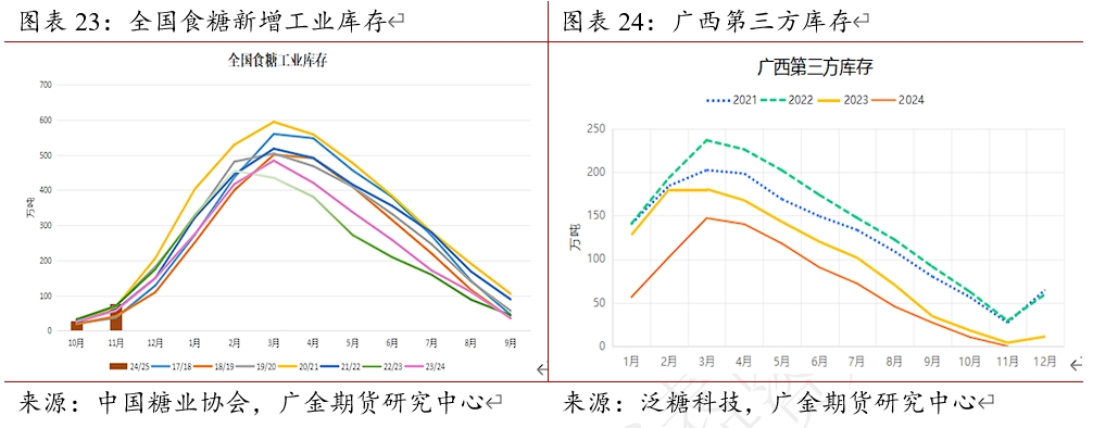 23/24榨季,结转库存35.72万吨,同比减少8.82万吨。 24/25榨季截止11月底,全国食糖新增工业库存为75.89万吨,同比增加18.89万吨。广西第三方库存基本清库。