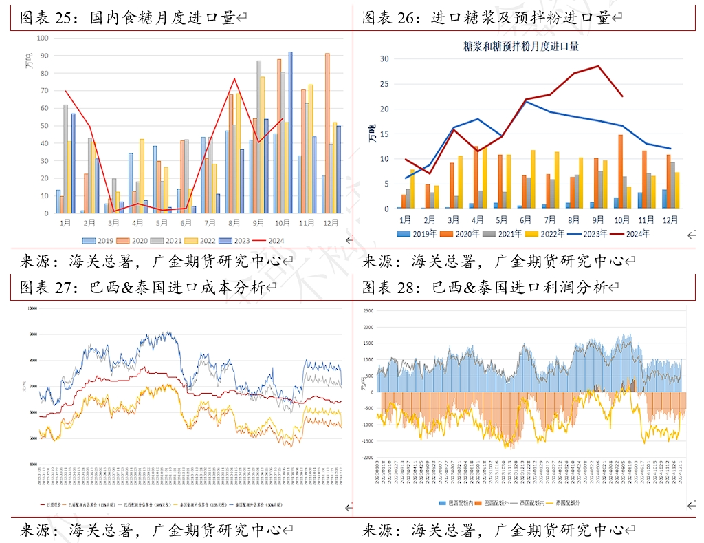 如我们在24年半年报预计那般,随着4月中旬原糖期价跌至 20 美分/磅之下,国内配额外进口窗口打开,加工厂配额外进口订货量有所增加,下半年合计进口180万吨—200万吨。