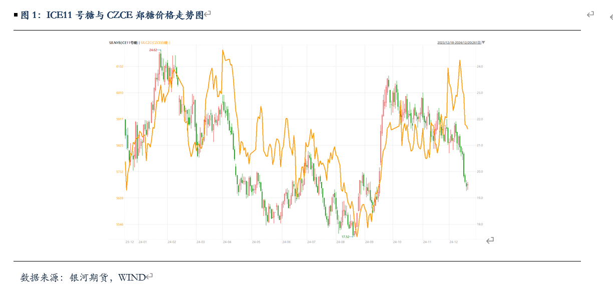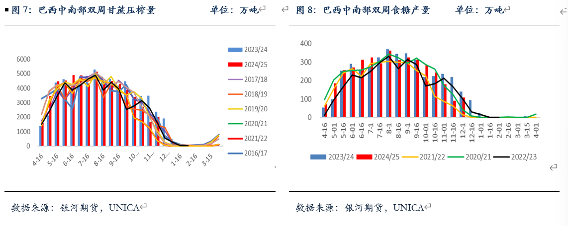 巴西24/25榨季压榨已进入尾声,天气风险导致的产量预期变化即将尘埃落定。巴西自24/25榨季开榨起、压榨进度受天气风险的影响而忽快忽慢,而市场的担忧情绪导致原糖盘面交易逻辑频繁转换、原糖价格走出过山车式波动。制糖比方面,此前市场预期24/25榨季巴西中南部制糖比或将提高至52%左右,然而在二季度制糖比不增反降、5月下半月制糖比低于去年同期,至此原糖价格开始走高。四季度随着巴西压榨进入尾声、产量预期逐渐确定,盘面开始向下修正。考虑到收榨糖厂数量的增加,利空驱动逐渐减弱,盘面短期下行空间和力度有所减弱。