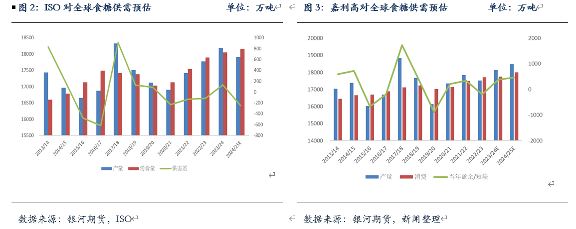 各机构对于24/25榨季食糖供需格局预判有所不同,不过大部分机构预估供应过剩。国际糖业组织ISO于11月20日发布报告中显示,预计24/25榨季全球食糖总产量为1.7907亿吨,较上期预测略有下降,较2023/24榨季创纪录的1.8137亿吨低1.3%。2024/25榨季全球食糖供应短缺预估从之前的358万吨下调至251万吨。Stone X预计2024/25年度全球食糖过剩214万吨,此前认为过剩121万吨。嘉利高也在向上修正过剩预估数据,嘉利高于4月预计23/24榨季全球食糖市场将供应过剩470万吨。6月将2024/25全球食糖市场将供应过剩提高至550万吨(2024/25榨季全球食糖产量为1.865亿吨,较之前预估值下调90万吨,但仍为有史以来的第二高位,因全球头号产糖国巴西产量创纪录,以及欧盟和泰国产糖量反弹;食糖消费量将超过1.80亿吨,较之前预估值下修100万吨)。综上,我们预计长周期国际糖市供需格局转变仍需等待巴西25/26榨季实际糖产,而波动节奏或将主要跟随巴西糖产预期的不断修正而有所变化。