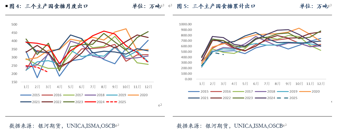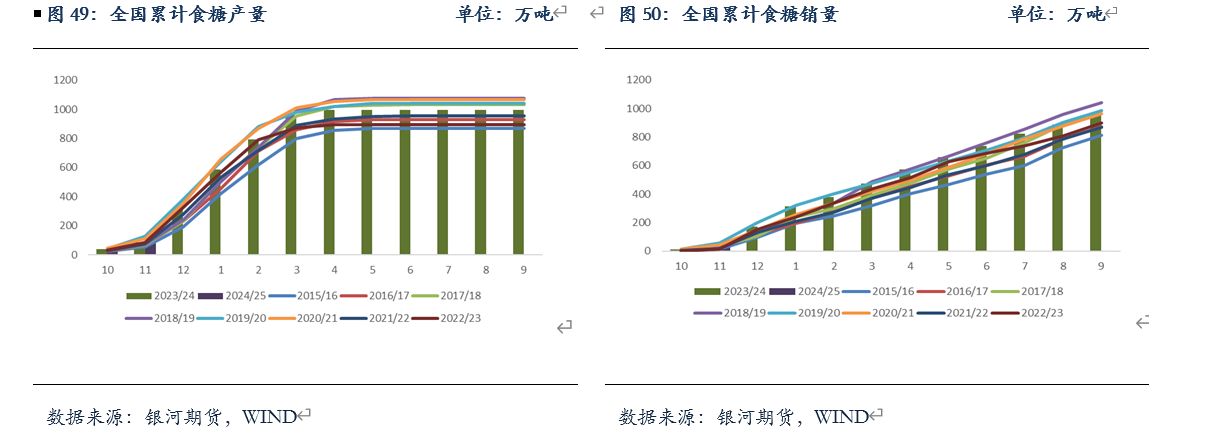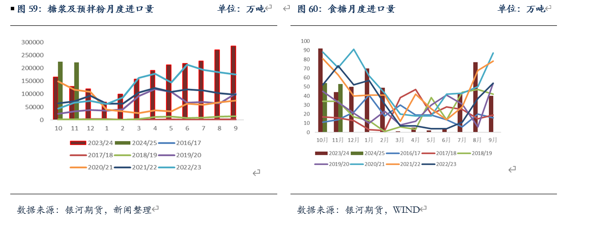 拌粉)实施暂时性措施。该政策的实施将对短期糖浆和预拌粉的进口量产生影响,利好近月合约。中长期的影响还需关注政策实施的时间长短和管控力度。24/25榨季我国累计进口糖浆及预拌粉数量或将同比减少,其中25年Q1减量或将尤为明显,后续还需关注政策实际落地情况。