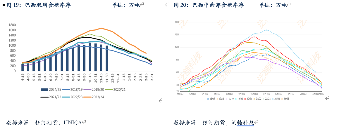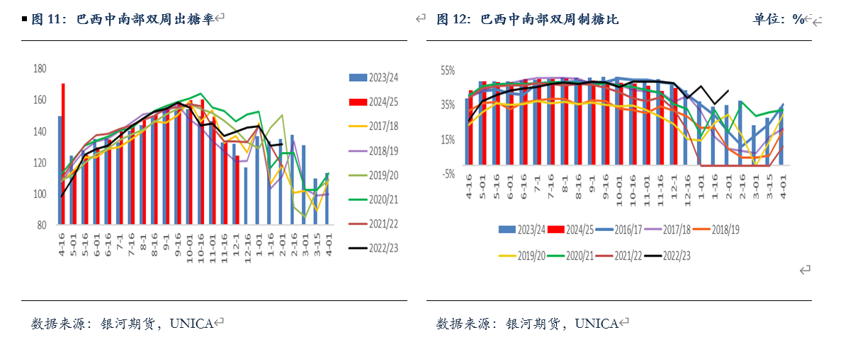 巴西24/25榨季库存处于偏低水平。本榨季截至11月底巴西中南部库存续降至897万吨,同比减少近650万吨,处于近6个榨季同期最低水平。其中高等级原糖库存500万吨,同比减少490万吨。目前低库存或将制约巴西未来几个月直至新榨季开榨前的出口国供应,预12月至明年3月期间的月均出口上限将在150万吨,低于最近10个榨季同期的平均水平。而25/26榨季糖厂的开榨时间将是影响贸易流供应的主要变数。