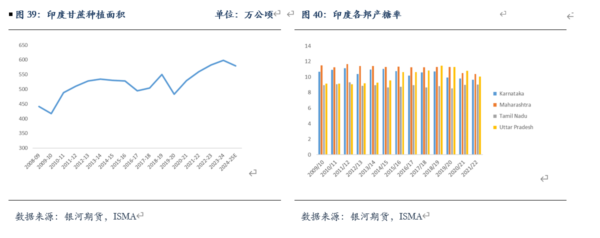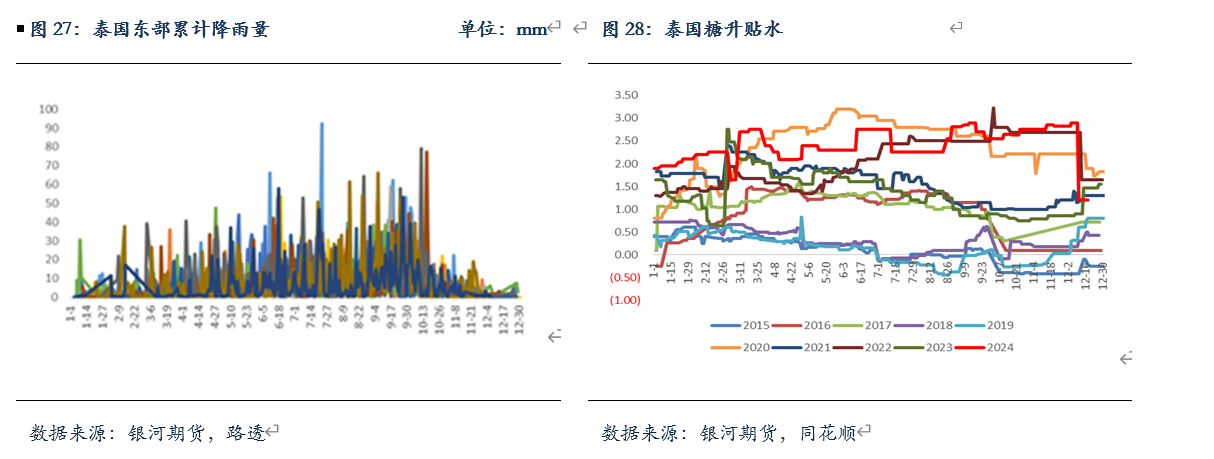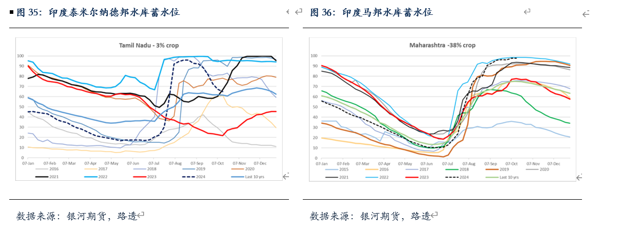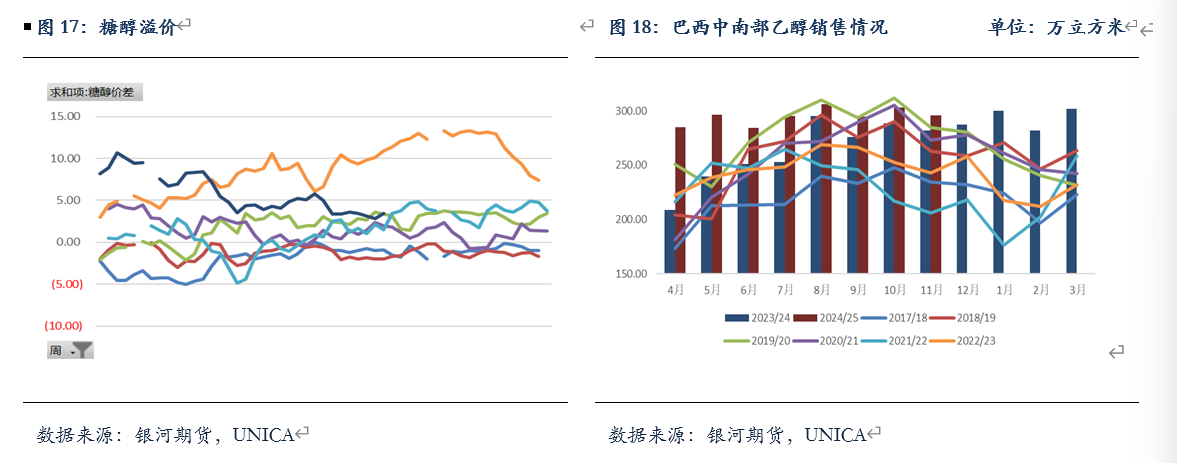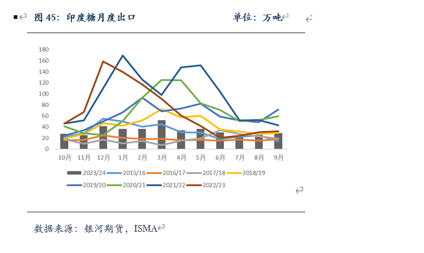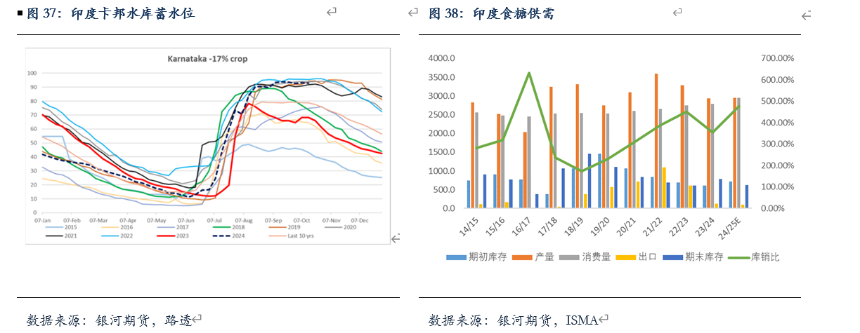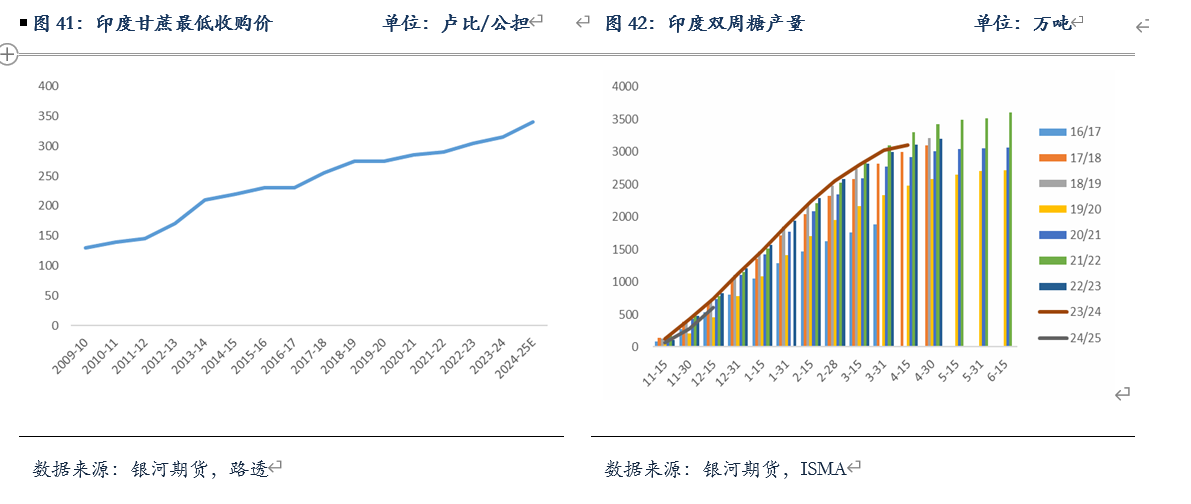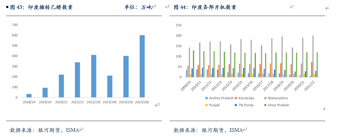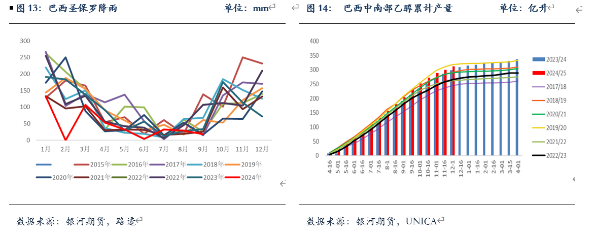 新榨季甘蔗&食糖产量与天气情况方面,季风的到来带动印度和泰国的降雨量有所增加,对新榨季甘蔗生长有一定促进作用。除此以外,印度继续推行乙醇E20目标,新榨季甘蔗生产食糖和出口或将受此影响。据报道,印度政府认为乙醇混合计划对于实现绿色能源承诺和增强糖厂的财务稳定性至关重要,目前正在考虑从2024年11月开始提高乙醇价格的提案,同时还提倡原料多样化,以实现到 2025/26年乙醇掺混率达到20%的目标。据印度糖厂和生物能源制造商协会ISMA称,用B重糖蜜和甘蔗汁生产乙醇需要400-450万吨糖,能够生产40-45亿升乙醇,并在2024/25年度实现18%的混合目标。印度E20乙醇混合比例于2024年11月达到16.1%。在这一进展的鼓舞下,政府设定在2025/26年度结束前达到20%混合比例的目标。