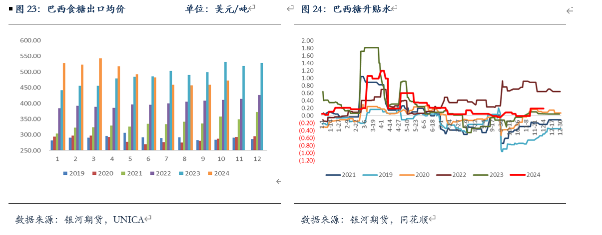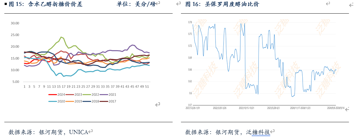 2024年巴西乙醇折糖价基本维持在15美分/磅左右,糖醇价差处于历史高位水平。上半年巴西燃料乙醇价格重心上移,主要得益于含水乙醇相对于汽油更具竞争优势的价格,至此带动巴西乙醇需求强劲。展望新榨季,预计仍将利多制糖比,25/26榨季制糖比或将继续维持高位。