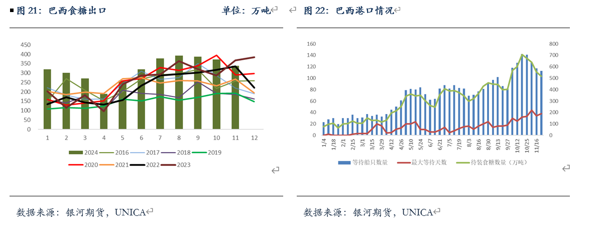 全球糖源供给集中在巴西,巴西糖出口维持高位。11月巴西糖出口339.1万吨,较10月份有所放慢,同比减少6.9%,但仍保持在300万吨以上。2024/25榨季4-11月巴西已累计出口糖2668万吨,同比增加18.21%,出口量为近年最高位。