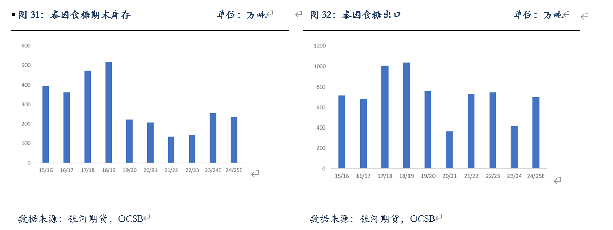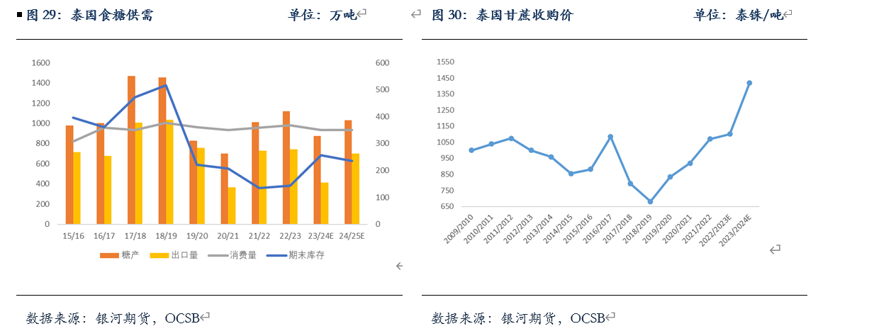 根据OCSB预计,2024/25榨季种植面积同比增加3.37%至11.5万公顷,主要原因是木薯等竞争作物价格下降幅度大导致种植甘蔗优势显著高于其他农作物,除此以外,甘蔗收购价的上调(22/23榨季政府公布的甘蔗收购基准价为1100泰铢/吨,23/24榨季甘蔗收购价为1420泰铢/吨)亦对甘蔗种植面积的增加有所提振。考虑到木薯价格下行,预计未来甘蔗种植面积仍然有增加空间。丰益国际预计泰国甘蔗种植面积有增加10%以上的趋势,并且单产有望高于4吨/亩。预计2024/25榨季泰国食糖产量将达1100万吨。预计食糖出口量为900万吨。