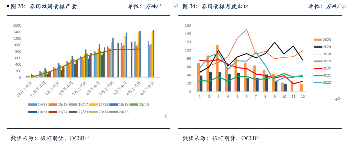 根据海关数据,泰国11月出口糖22.24万吨,同比减少17.5%,24/25榨季10-11月累计出口糖共计出口糖41.6万吨,同比减少12.6%,预计12月份出口将增加。自12月初泰国开榨以来现货升水报价承压,12月船期的泰国原糖现货升水下降至120个点左右,而有关中国可能暂停从泰国进口液体糖和预混糖的消息也导致泰国精制糖现货报价持续下降,关注后期政策变化对泰国糖需求的潜在影响。