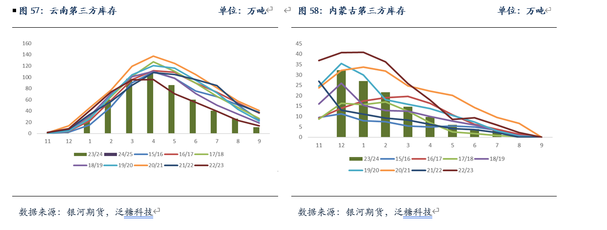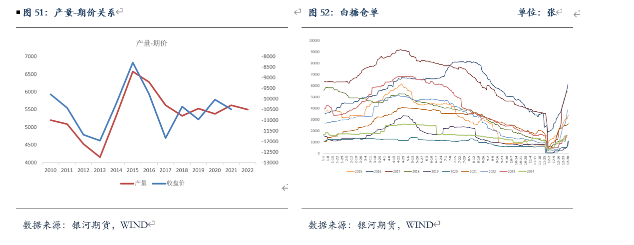 综上,2025年上半年配额外进口糖或受成本较高影响维持偏低进口量,而糖浆及预拌粉部分受泰国糖浆及预拌粉进口政策的影响、预计进口量或将同比减少,由此,上半年国产糖销售受其他糖源冲击较小。不过考虑到糖价上方空间或受糖厂套保限制,预计上方空间有限。下半年国内需要进口糖弥补供需缺口,郑糖或随着原糖下行,叠加25/26榨季国内糖料面积或将进一步增加,预计下半年郑糖或呈现下行走势。不过还需关注糖浆及预拌粉管控政策风险,若政策趋紧,那么或对郑糖有所支撑。