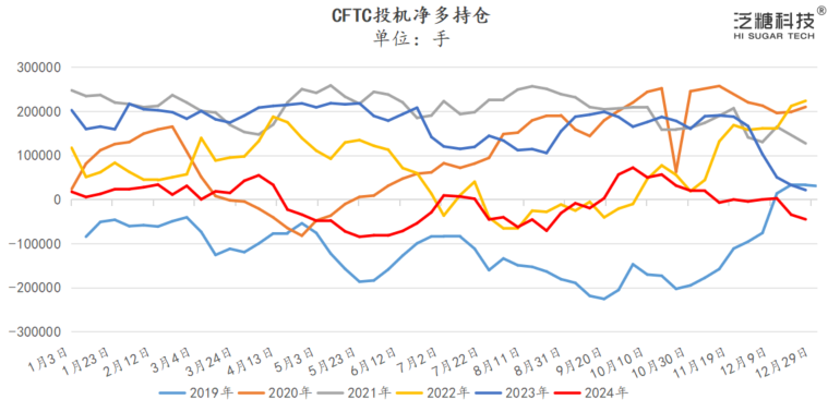 截至12月24日当周,ICE原糖期货+期权总持仓为1092684手,较前一周增加20460手。投机多头持仓167330手,较前一周减少246手;投机空头持仓212515手,较前一周增加10203手;投机净空持仓为45185手,较上周增加10449手。