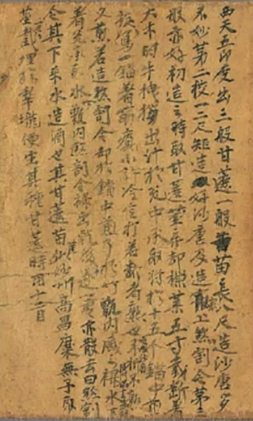 西天五印度出三般甘(蔗):一般苗长八尺,造沙唐(糖)多不妙;第二,挍一二尺矩,造好沙唐(糖)及造最上煞割令;第三般亦好。初造之时,取甘(蔗)茎,弃却樔(梢)叶,五寸截断。着大木臼,牛拽,拶出汁,于瓮中承取。将於十五个铛中煎,旋写(泻)一铛。着筋(筯),瘨(置)小(少)许。冷定,打。若断者,熟也,便成沙唐(糖)。不折,不熟,又煎。若造煞割令,却於铛中煎了,於竹甑内盛之禄(漉)水,下着瓮承取水,闭门。满十五日,开却。竹甑内煞割令禄(漉)出干后,手遂(碎?)一处,亦散去,曰煞割令。其下来水,造酒也。其甘(蔗)苗茎,似沙州、高昌糜,无子。取茎一尺以截,埋于犁垄,便生。其种甘(蔗)时,用十二月。