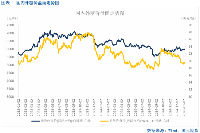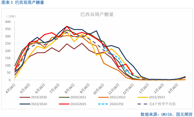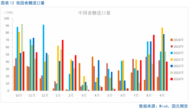 国外供需格局:中性。1)UNICA协会公布的巴西2024年12月上半月产糖数据又上修了巴西的累计产糖量,截至12月上半月累计产糖量为3971.1万吨,超过了近6个榨季的同期平均产糖量。2)新季泰国食糖产量预计在1100万-1150万吨。由于种植木薯收益下降,泰国新季甘蔗种植面积增幅可观。目前,泰国甘蔗总体长势较好,预计甘蔗总体单产提升20%,新季蔗产量在1亿吨左右,甘蔗出糖率为11.27%,食糖产量为1150万吨。3)印度ISMA协会表示,由于单产下降,截至2024年12月底,印度食糖产量同比下降15.5%。