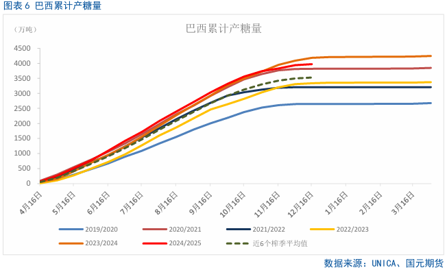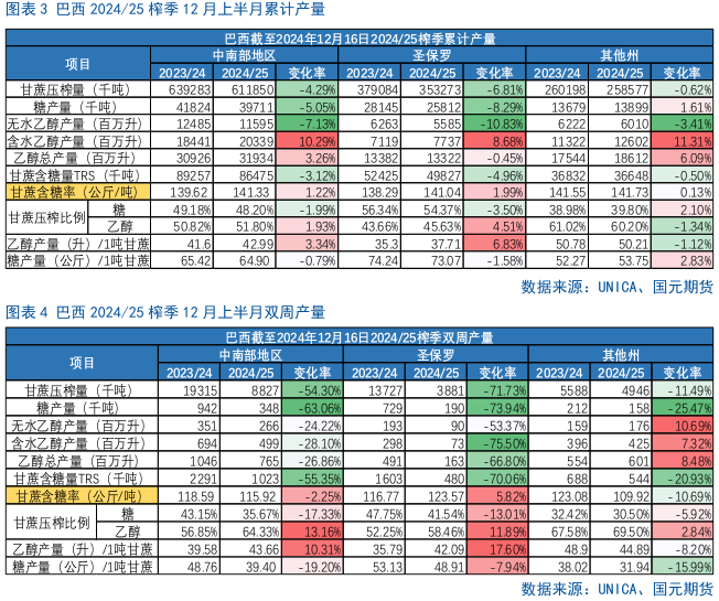 2024/25榨季截至12月上半月,巴西中南部地区累计入榨量为61185万吨,较去年同期的63928.3万吨减少2743.3万吨,同比降幅达4.29%;甘蔗ATR为141.33kg/吨,较去年同期的139.62kg/吨增加1.71kg/吨;累计制糖比为48.2%,较去年同期的49.18%减少0.98%;累计产乙醇319.34亿升,较去年同期的309.26亿升增加10.08亿升,同比增幅达3.26%;累计产糖量为3971.1万吨,较去年同期的4182.4万吨减少211.3万吨,同比降幅达5.05%。