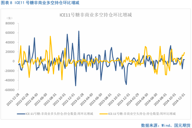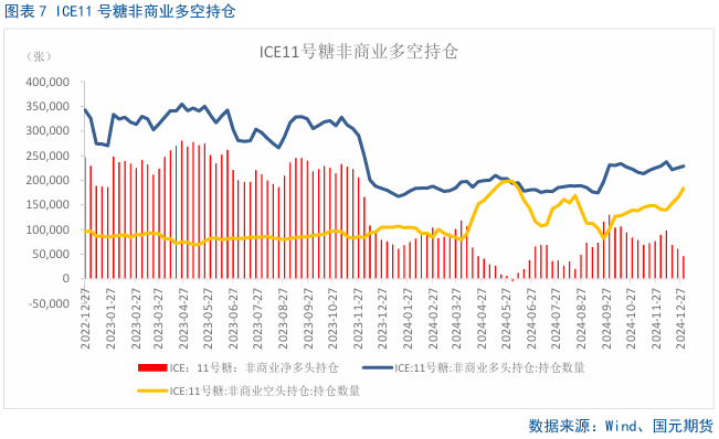 巴西近期降雨状况良好,缓解了市场对其干早的担忧,同时北半球方面甘蔗压榨季节正在持续推进,国际市场供应相对充足,糖价承压。据CFTC公布的最新周度持仓报告显示,截止12月31日当周,对冲基金及大型投机客持有的原糖净多头仓位为45119手,创四个月新低,较之前一周减少14975手,连续三周下降。多头持仓为228766手,较之前一周增加3460手,空头持仓为183647手,较之前一周增加18435手。