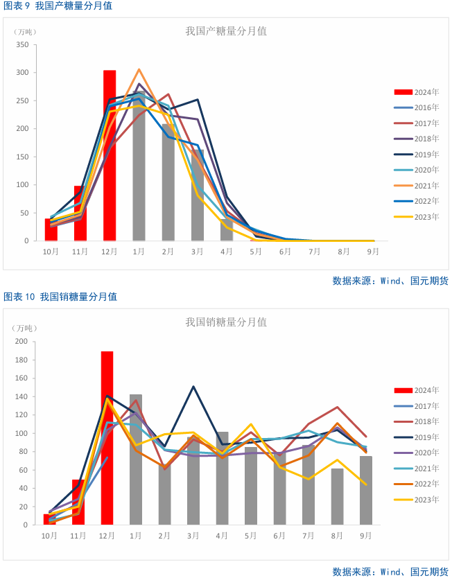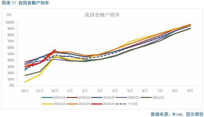 国内供需格局:偏空。2024/25年度国内食糖产量预计显著回升,或达到1100万吨之上。临近春节,12月我国食糖产销双增。