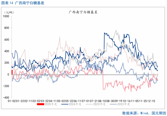 据中国糖业协会数据显示,截至2024年12月底,新榨季甜菜糖厂已有3家停机,甘蔗糖厂除云南、海南外,其他省(区)糖厂均已开榨。全国共生产食糖440.34万吨,同比增加120.83万吨,增幅37.82%;全国累计销售食糖249.94万吨,同比增加80.12万吨,增幅47.18%。国产糖上市高峰叠加春节备货,食糖整体产销双旺,给予糖价下方一定支撑。但随着春节备货临近尾声,下游终端采购以刚需为主,食糖销售或有所放缓,持续关注库存变动。