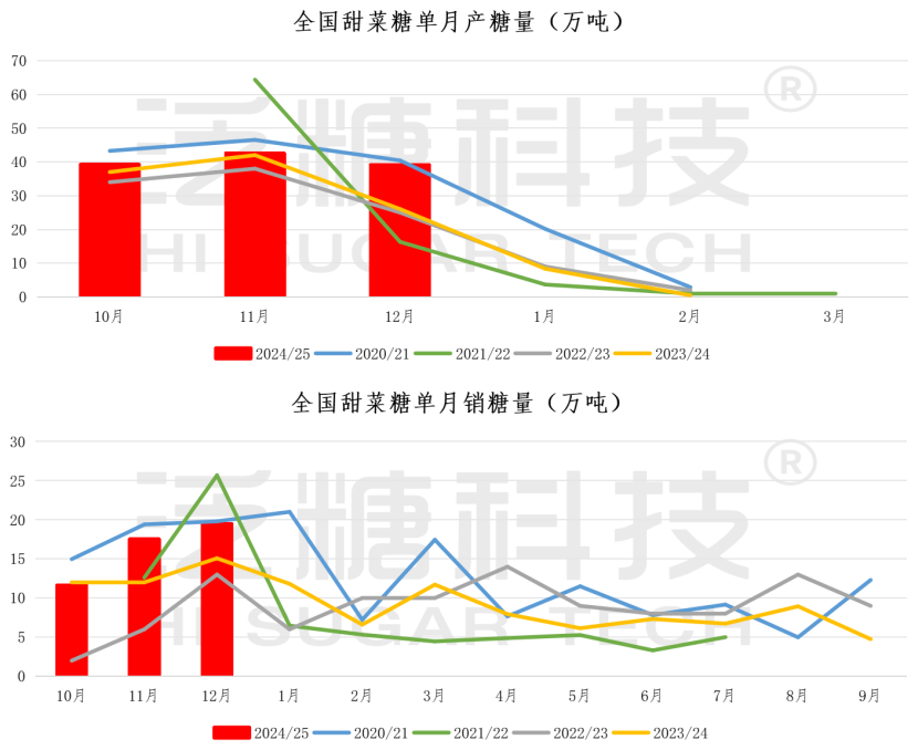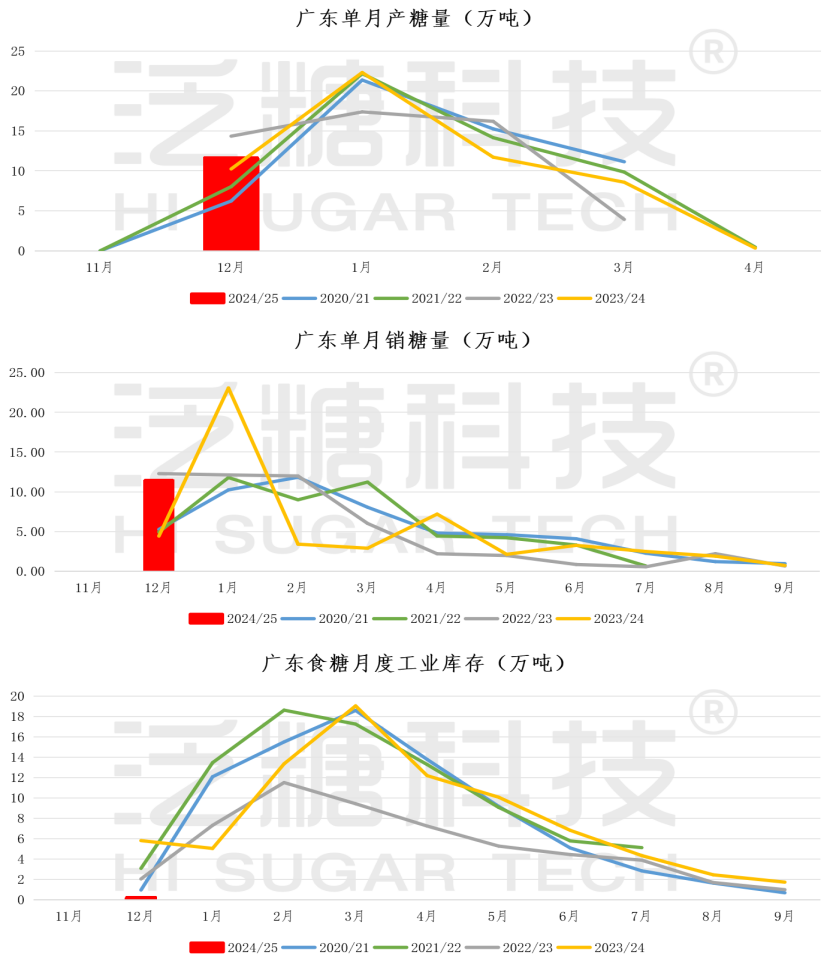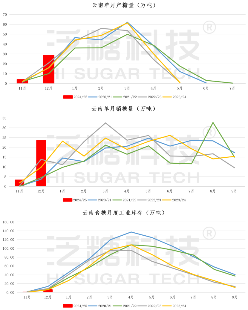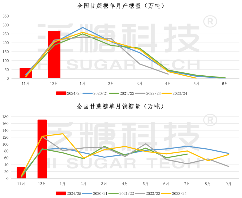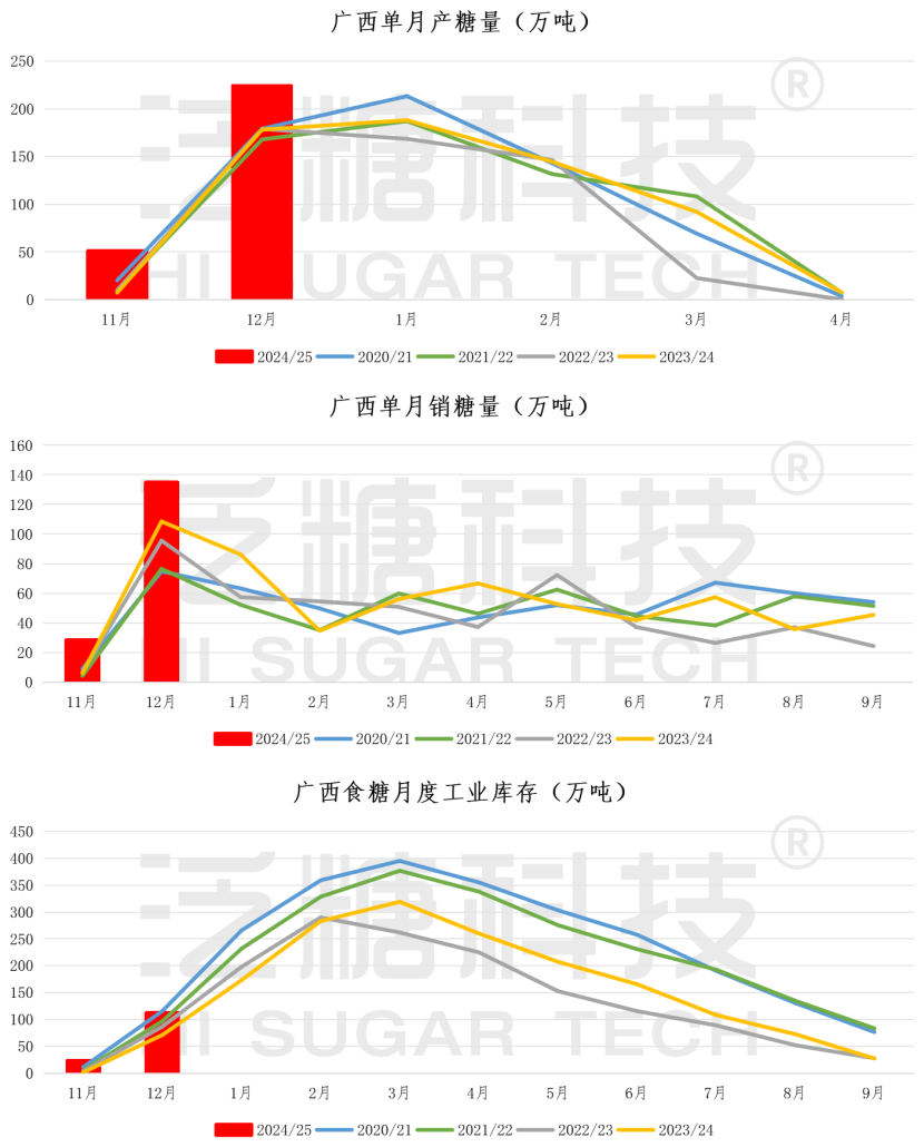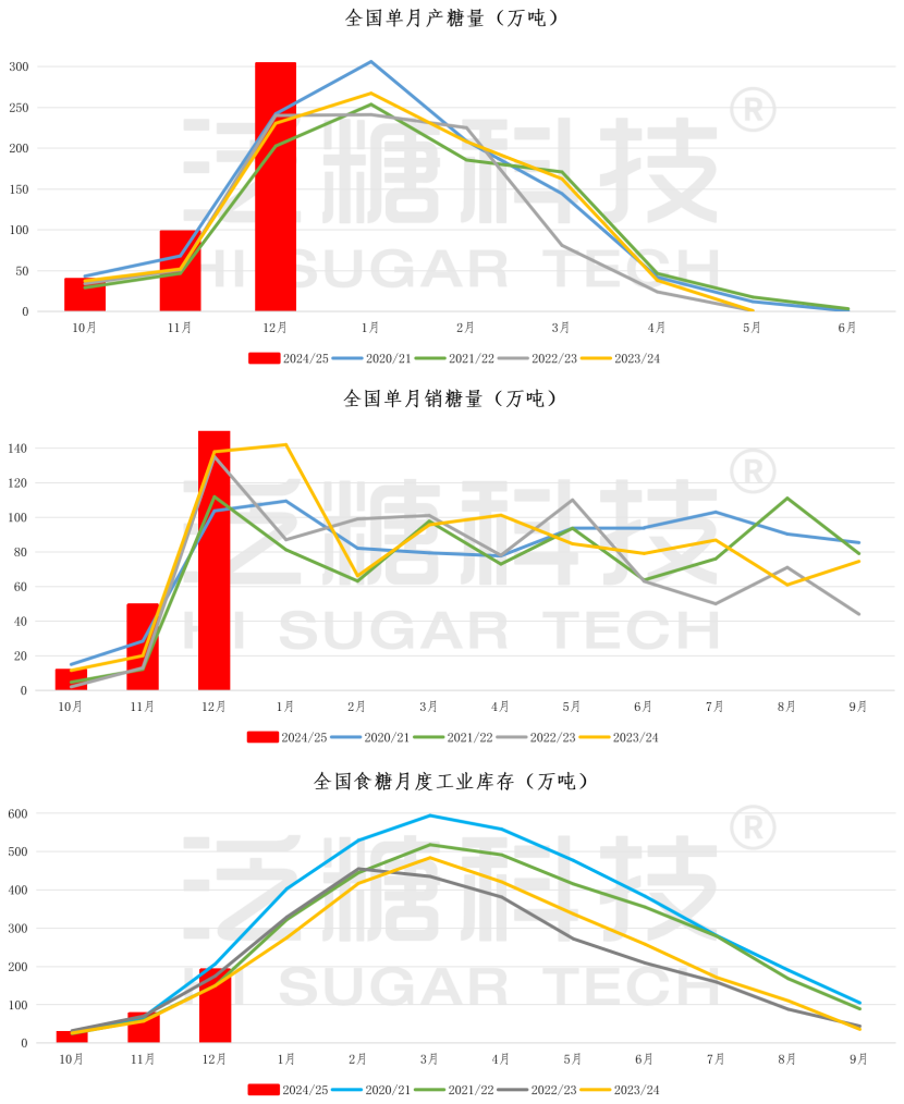其中,12月单月产糖303.55万吨,同比增加70.04万吨;销糖189.04万吨,同比增加51.22万吨,月产量、销量均创历年同期最高记录。