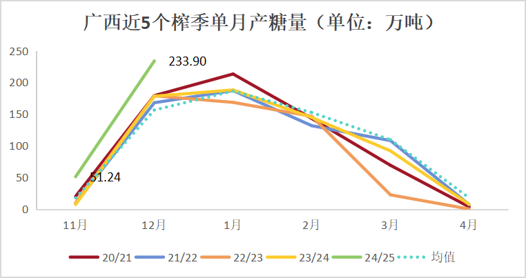 截至12月31日,2024/25年榨季广西已有74家糖厂开榨,同比持平;累计入榨甘蔗2148.18万吨,同比增加599.63万吨;产混合糖275.14万吨,同比增加89.5万吨;混合产糖率12.81%,同比提高0.82个百分点。其中,12月单月产糖223.9万吨,同比增加45.64万吨。