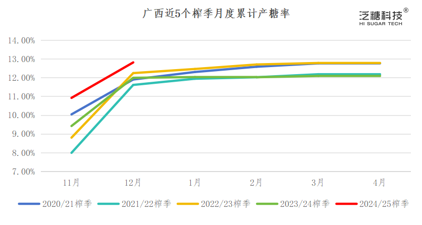 据广西糖业协会数据,广西最高的产糖率记录为2019/20榨季的13.11%。截至12月31日,全区累计产糖率达到了12.81%,同比增加了0.82个百分点。根据调研信息,桂北糖厂的产糖率多在13%以上,甚至达到14%的历史极值水平,远高于崇左地区糖厂的产糖率。