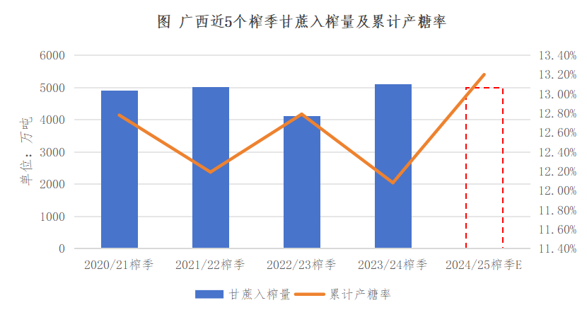 综合评估后,我们将2024/25榨季的广西榨季累计产糖率将调升至13.2%,同比增1.12个百分点。