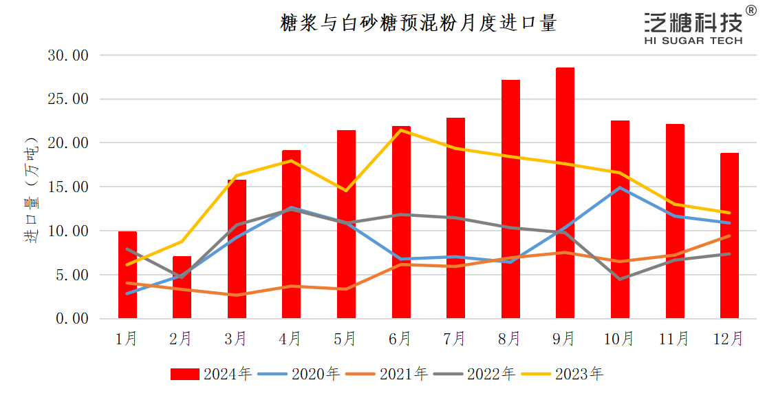 据海关总署数据,2024年12月我国进口糖浆、白砂糖预混粉(税则号列170290)18.76万吨,环比上月下降3.28万吨,降幅14.88%。