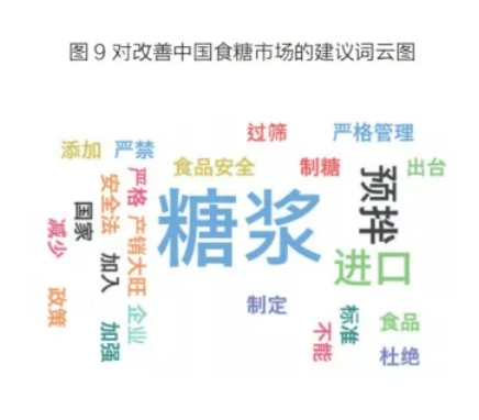 糖浆、进口、预拌、严禁、食品安全等词汇表明市场对改善相关产品的进口现状有较大期待。这张词云图建议加强对糖浆和预拌粉的市场监管和政策管控,提高产品质量和安全标准(图9)。