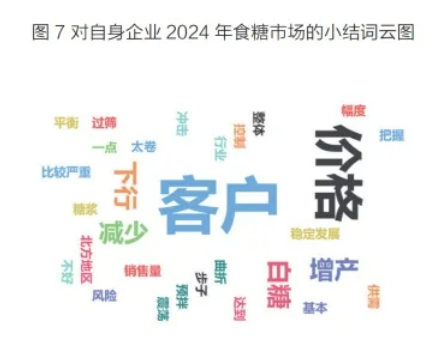 词云图显示,客户满意度、产品价格与市场细分、供需与产销、替代品等是关键焦点,“客户”是核心关注点。表明食糖市场中满足和超越客户期望是至关重要的(图7)。