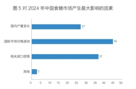 根据数据显示,国际市场价格波动(45票)、相关进口政策(37票)和国内产量变化(27票)影响2024年中国食糖市场,表明市场参与者对外部市场因素的敏感度较高(图5)。
