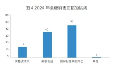 根据数据分析,预拌粉糖浆的冲击(50票)、需求低迷(40票)是食糖销售中面临的主要挑战(图4)。