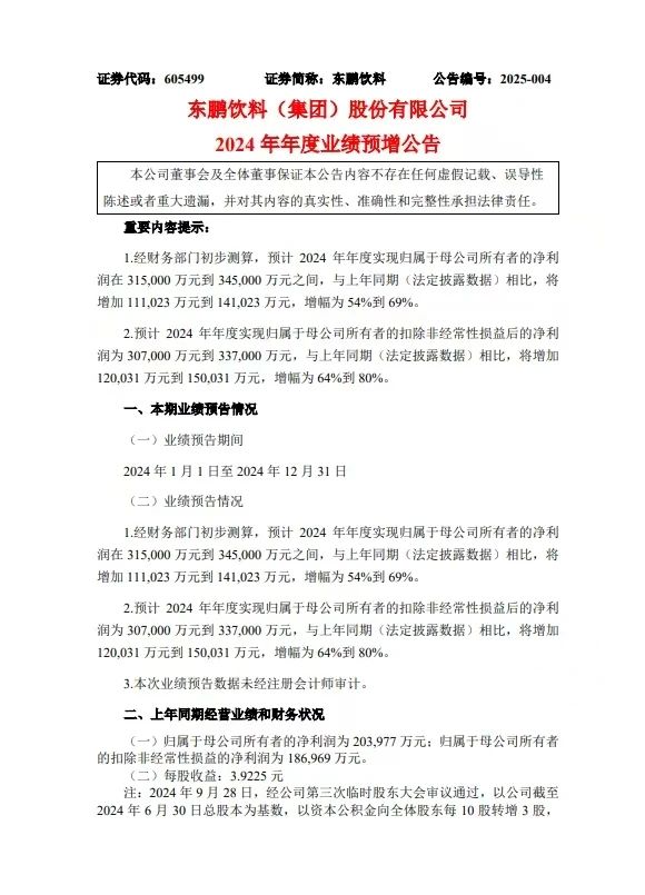 近日,东鹏饮料发布2024年年度业绩预增公告,预计2024年度归母净利润在31.5亿元至34.5亿元之间,比上年增加11.1亿元至14.1亿元,增幅为54%至69%。