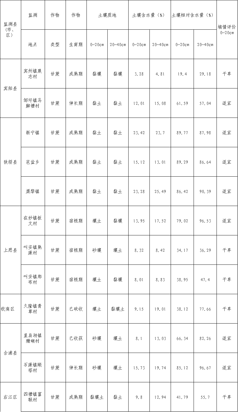 桂南地区:扶绥县、合浦县监测点土壤相对含水量为66.34%—89.77%,墒情适宜;上思县监测点土壤相对含水量为34.17%—79.02%,墒情大部干旱、局部适宜;钦南区监测点土壤相对含水量为30.30%—47.36%,墒情干旱。