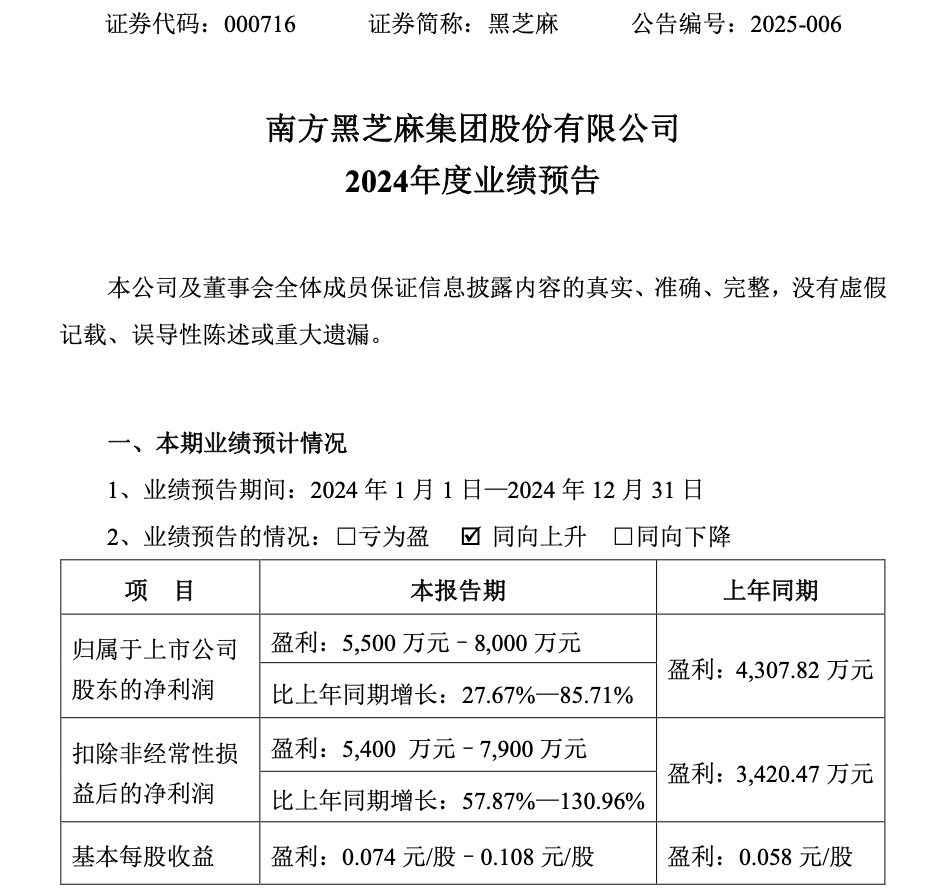 “南方黑芝麻糊”母公司黑芝麻2024年净利润预增超27%