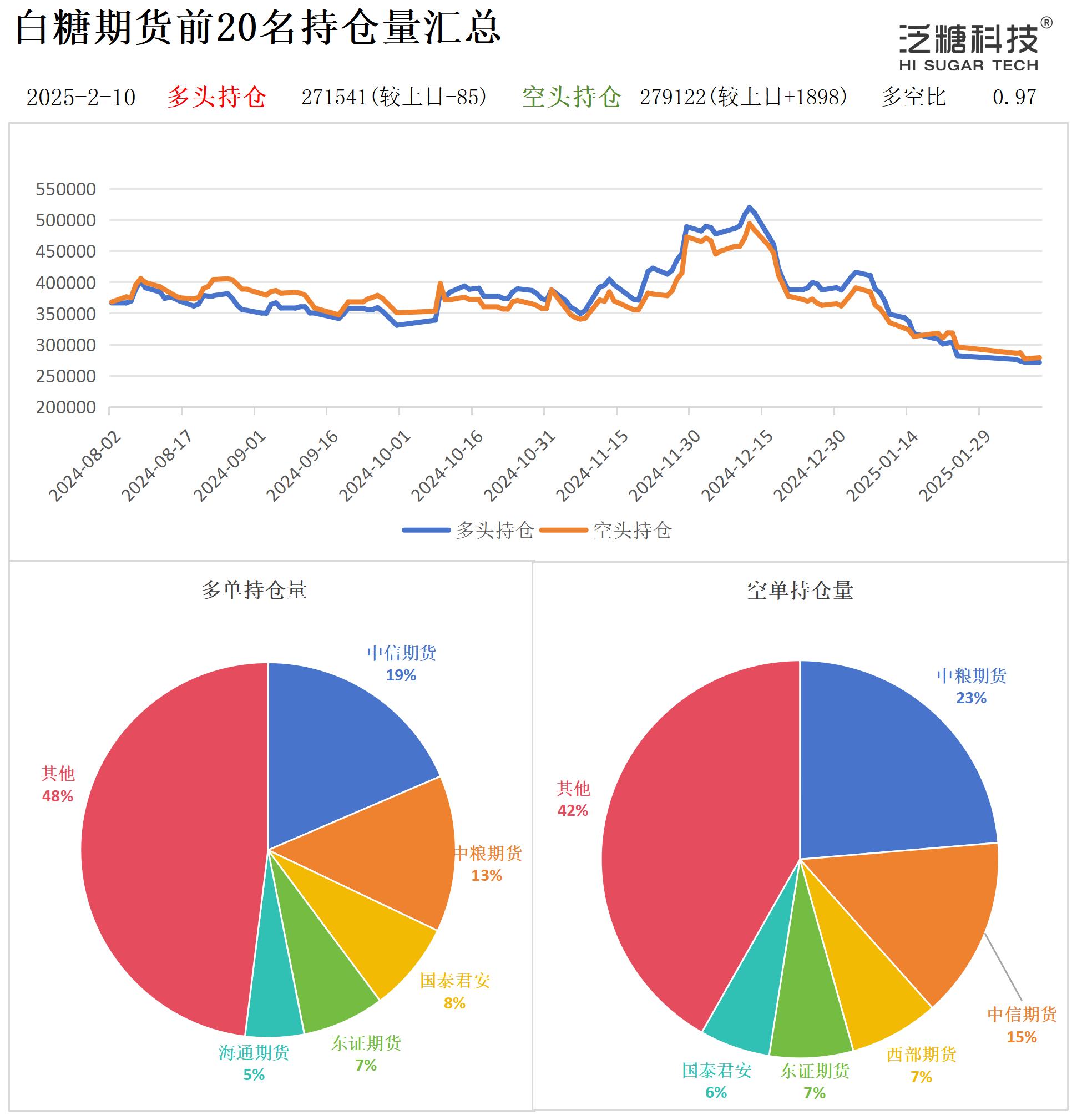 2025年2月10日,郑商所白糖期货前20名多头持仓为271541手,较上一交易日减少85手;前20名空头持仓为279122手,较上一交易日增加1898手,多空比为0.97。主要机构具体持仓结构如下:
