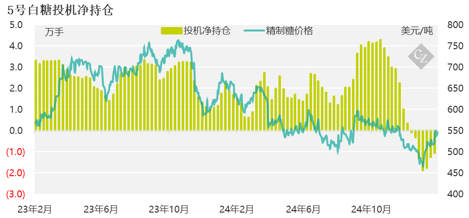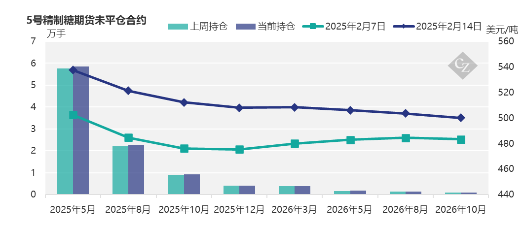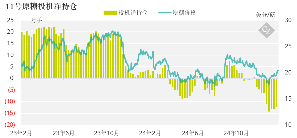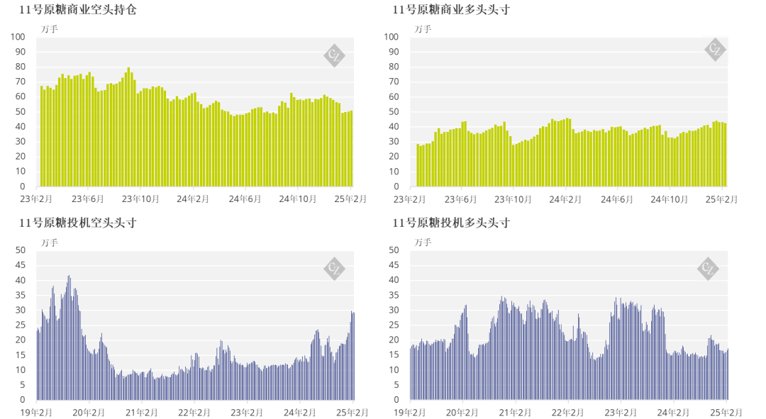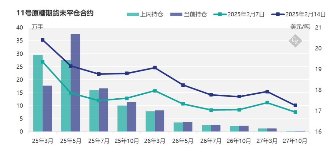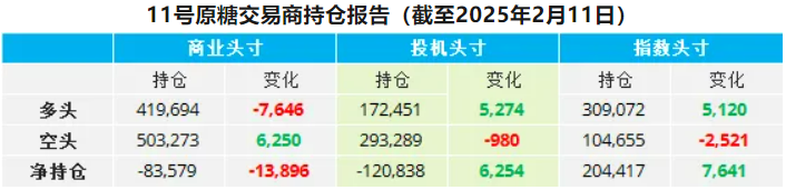 在截至2025年2月11日的当周,原糖买家平仓了7646手多头头寸,而生产商也趁价格走高增加套保持仓,增加了6250手空头头寸。