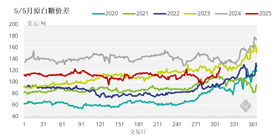 在2025年3月合约到期当周,2025年3/3月原白糖价差交易在每吨89.5-109.7美元区间。2025年5/5月原白糖价差目前交易在115.1美元/吨。