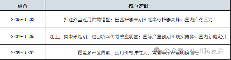 一般而言,巴西港口发船到达中国需要45天左右。因此在构建内外套时,ICE合约交割月份应早于郑糖合约,以确保到货时间匹配。以ICE03合约为例,3月交割的原糖经过45天运输,大约在4月中旬到达,刚好用于5月的郑糖合约交割。同样,ICE05对应SR07,ICE07对应SR09时间上更匹配,逻辑也更通顺。