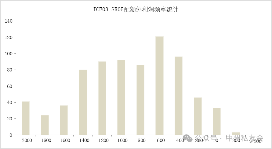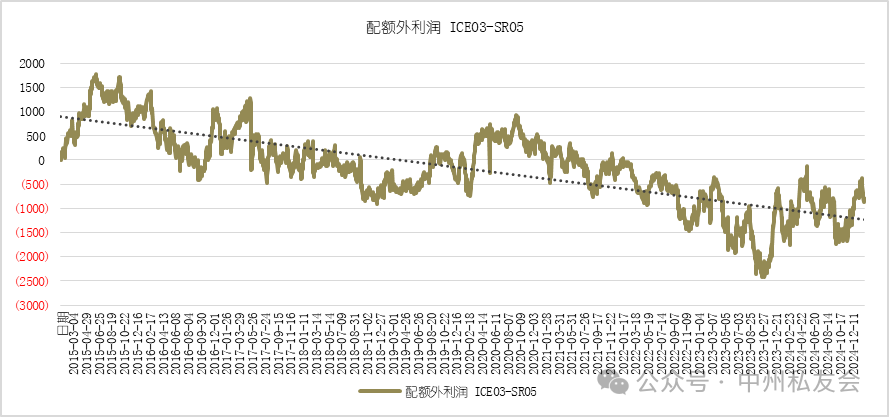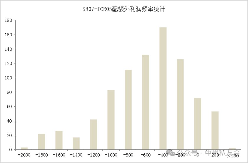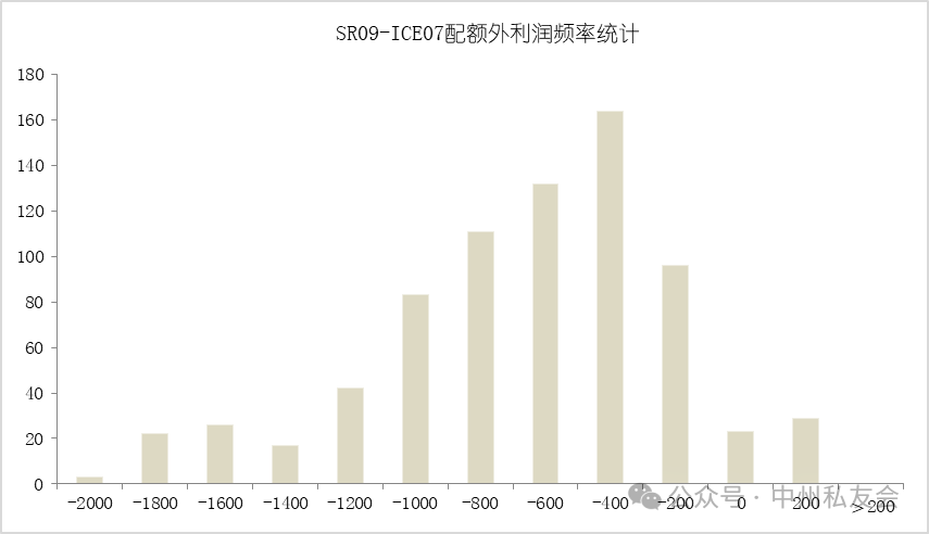 SR09与ICE07配额外进口价差的波动区间为【-1762,102】。SR09与ICE07配额外进口价差比SR07和ICE05的波动更窄,集中度高。20%/80%(低位/高位)的分位点为-1012/-327。