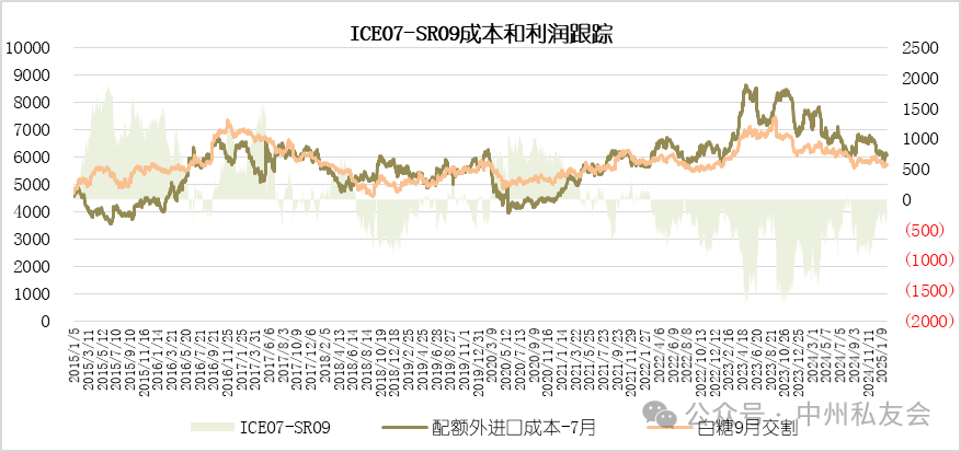 在2025年1月21日的原糖下跌行情中,ICE07收盘价最低为16.57美分/磅,按照即期汇率计算,对应的配额外成本下降至5827元/吨的水平,内外利润最低修复至-151元/吨。此次-151元/吨的利润位于负利润区间的95.7%,这意味着这两年内,近95.7%的时间段内,SR09与ICE07配额外进口利润都低于-151元/吨,所以也出现了部分加工厂点价07合约的情况。