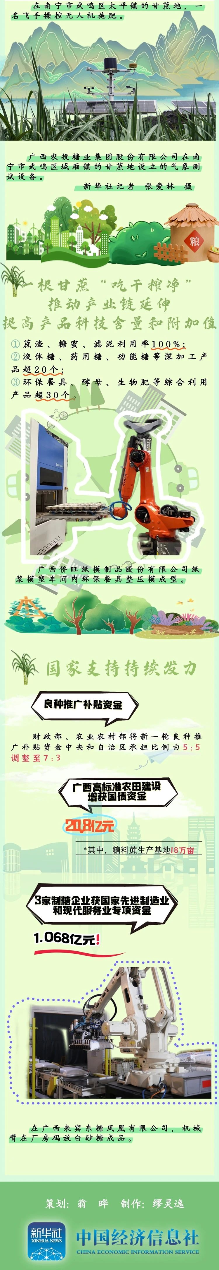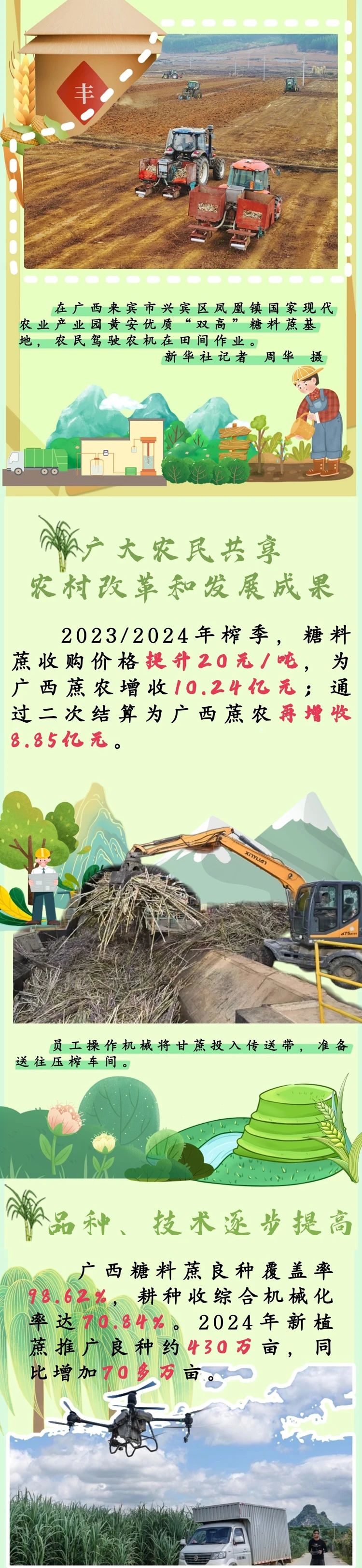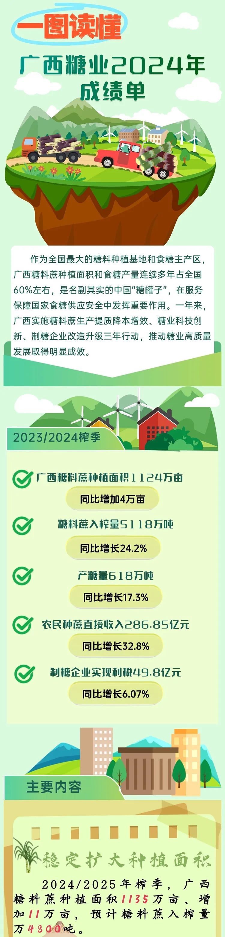 作为全国最大的糖料种植基地和食糖主产区,广西糖料蔗种植面积和食糖产量连续多年占全国60%左右,是名副其实的中国“糖罐子”,在服务保障国家食糖供应安全中发挥重要作用。一年来,广西实施糖料蔗生产提质降本增效、糖业科技创新、制糖企业改造升级三年行动,推动糖业高质量发展取得明显成效。