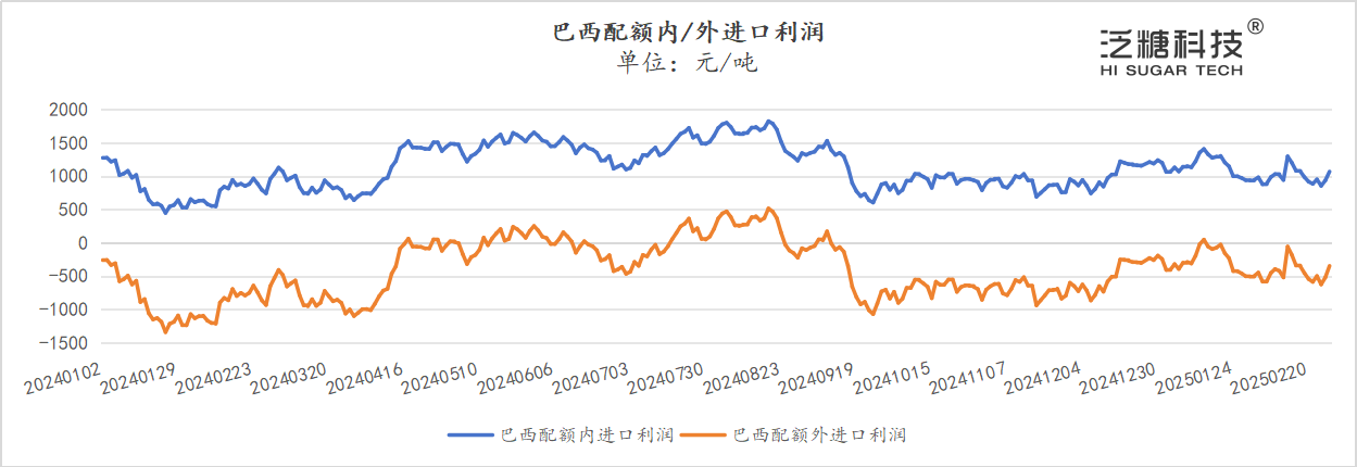 2025年3月19日,ICE原糖收盘价为19.65美分/磅,人民币汇率为7.2280。经测算,配额内巴西糖加工完税估算成本为5181元/吨,配额外巴西糖加工完税估算成本为6651元/吨;与日照白糖现货价比,配额内巴西糖加工完税估算利润为999元/吨,配额外巴西糖加工完税估算利润为-470元/吨。