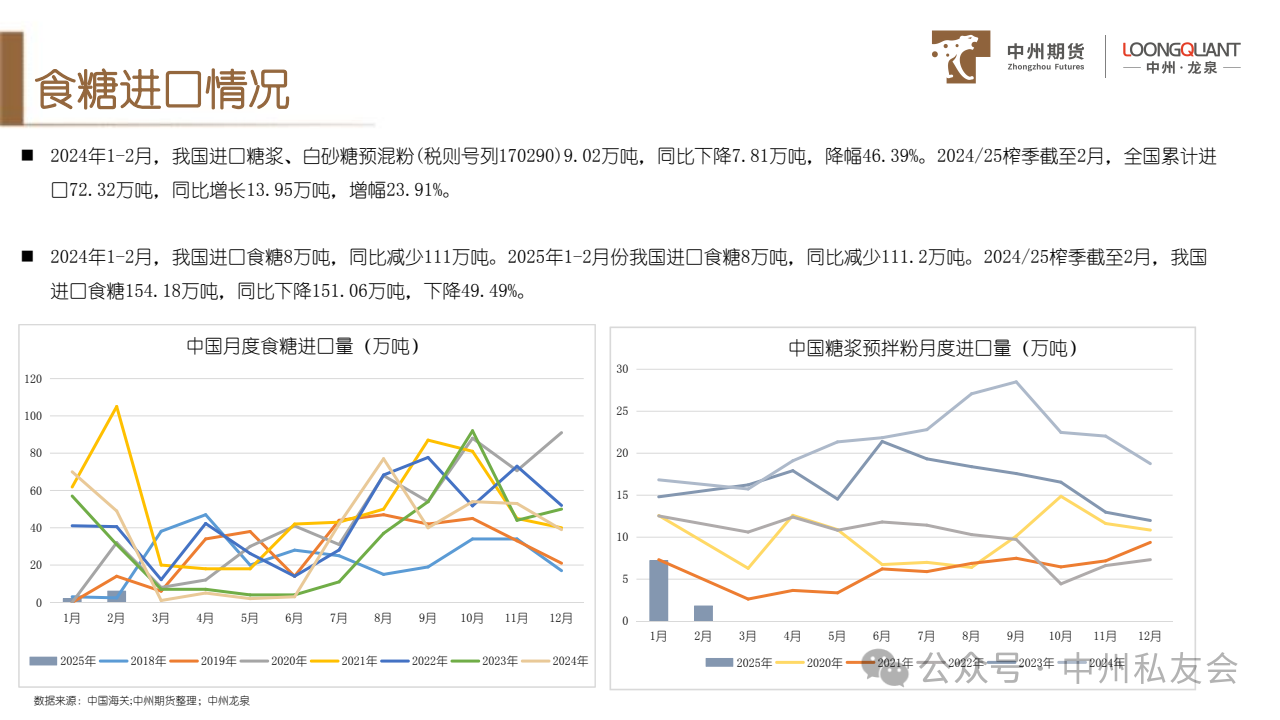 (4)2025年1-2月我国进口糖浆及白砂糖预混粉9.02万吨,同比减少7.81万吨。截至2月,累计进口72.32万吨,同比增加13.95万吨。继泰国糖浆预拌粉限制进口后,越南糖浆预拌粉也被限制,糖浆预拌粉供应管控严格。