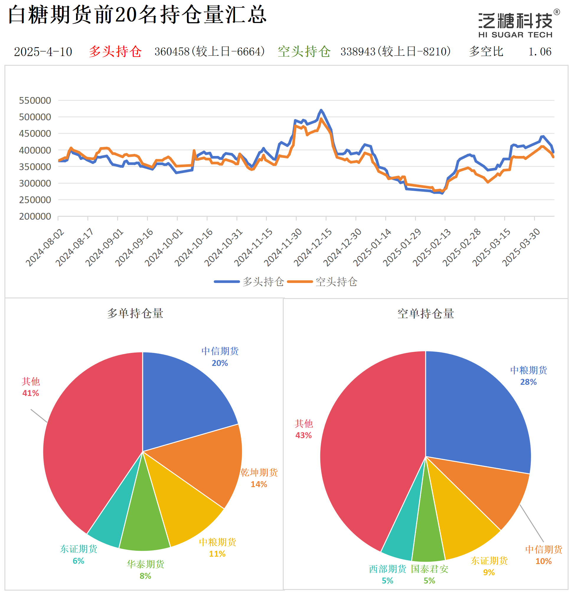 2025年4月10日,郑商所白糖期货前20名多头持仓为360458手,较上一交易日减少6664手;前20名空头持仓为338943手,较上一交易日减少8210手,多空比为1.06。主要机构具体持仓结构如下: