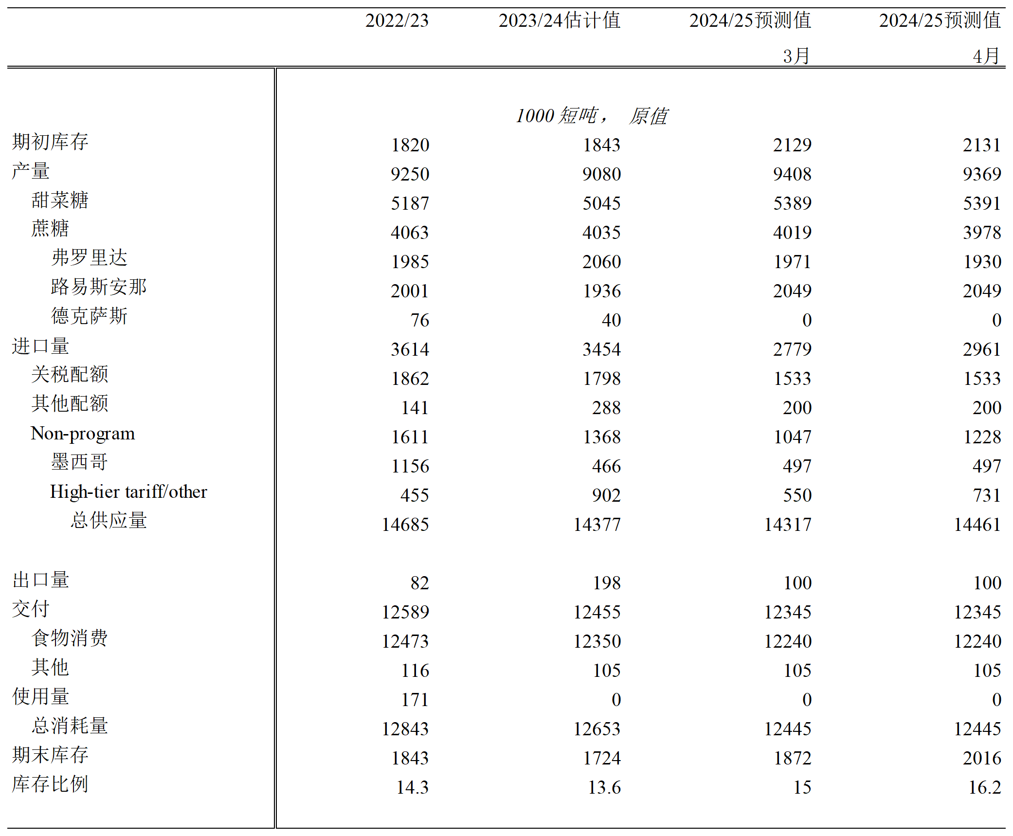 美国农业部(USDA)于4月公布的供需报告显示,美国2024/25榨季食糖总产量预计为936.9万短吨;其中,甜菜糖产量为539.1万短吨;甘蔗糖产量为397.8万短吨;食糖库存/消费比预估为16.2%。
