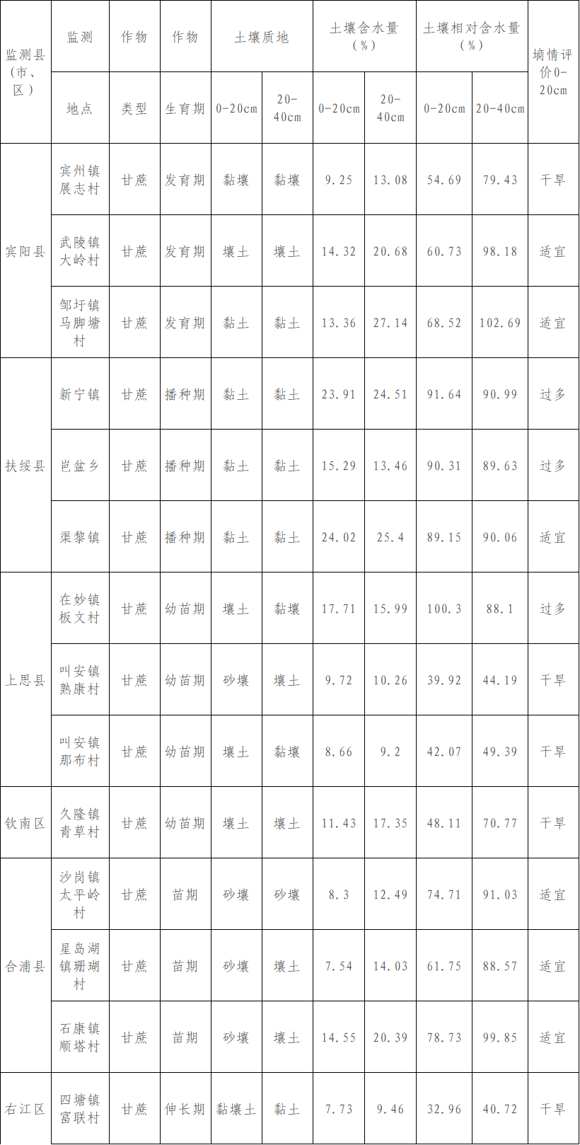 桂南地区:扶绥县监测点作物甘蔗,土壤相对含水量为89.15%—91.64%,墒情适宜至过多;合浦县监测点作物甘蔗,土壤相对含水量为61.75%—78.73%,墒情适宜;上思县监测点作物甘蔗,土壤相对含水量为39.92%—100.30%,墒情大部干旱、局部过多;钦南区监测点作物甘蔗和木薯,土壤相对含水量为42.22%—81.13%,墒情大部干旱、局部适宜。