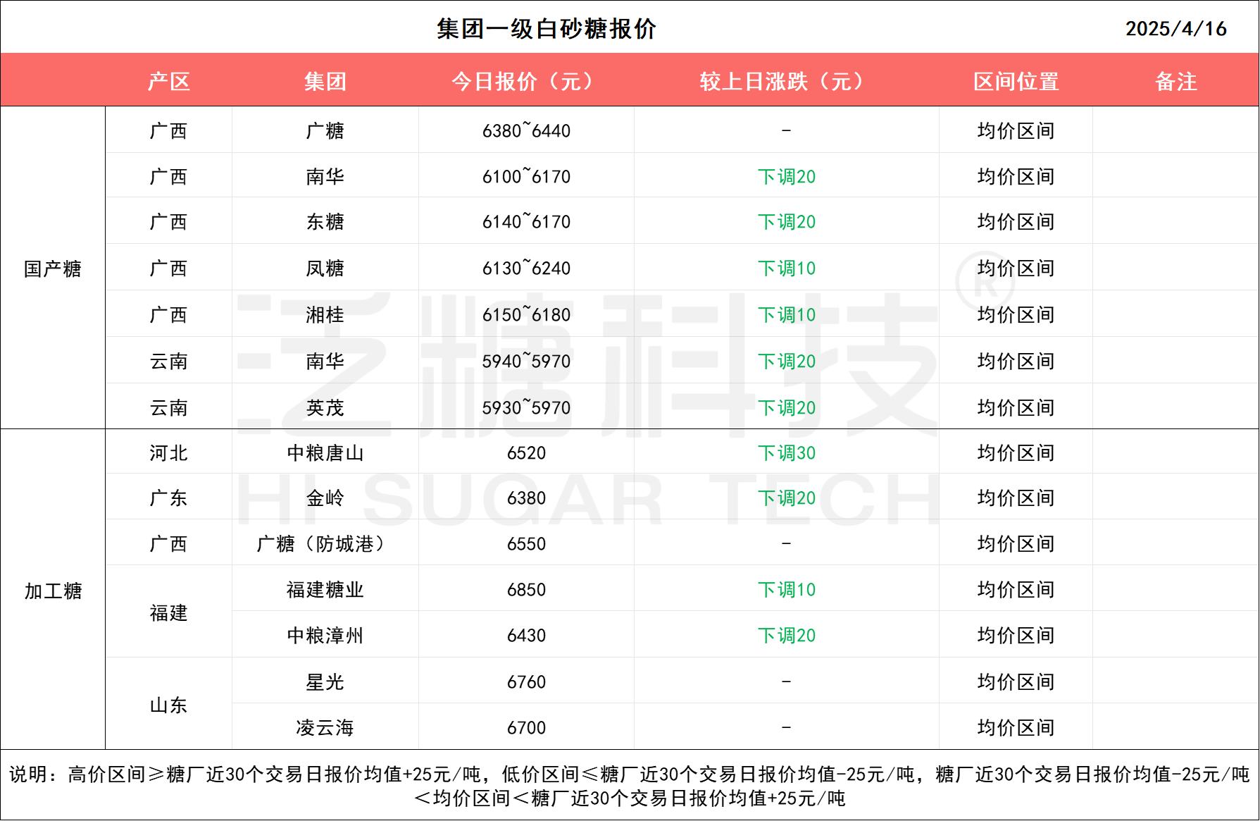 今日广西白糖现货成交价6069元/吨,下跌5元/吨;广西制糖集团报价6100~6240元/吨,部分下调10~20元/吨;云南制糖集团报价5930~5970元/吨,下调20元/吨;加工糖厂主流报价区间6380~6850元/吨,部分下调10~30元/吨。制糖集团今日报价整体下调,贸易商及下游终端仍以观望为主,现货整体成交一般。