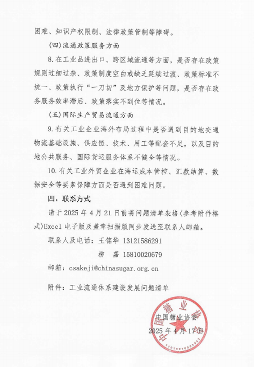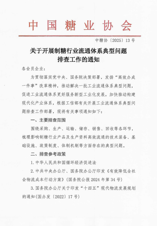 中国糖业协会:关于开展制糖行业流通体系典型问题排查工作的通知