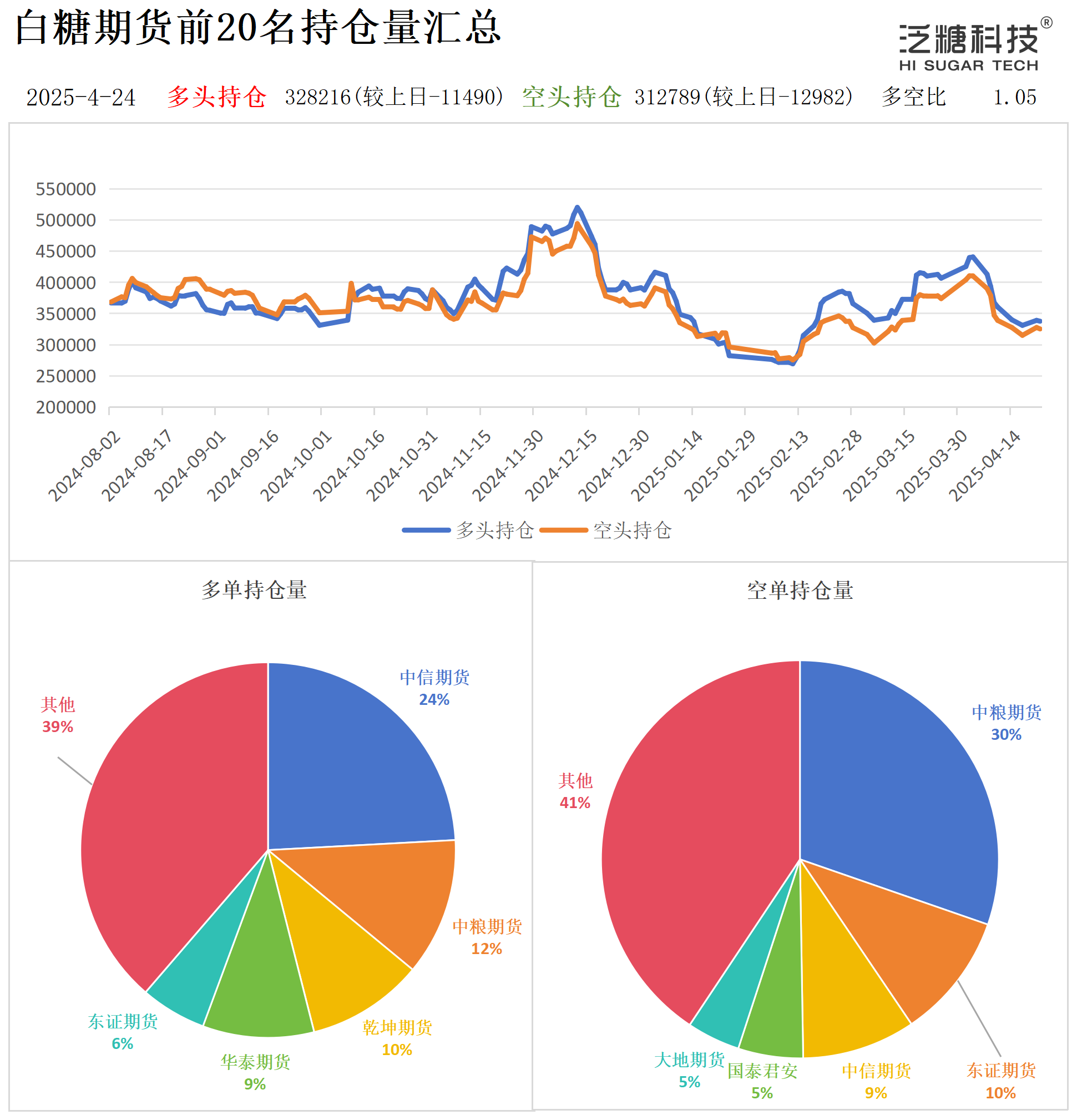 2025年4月23日,郑商所白糖期货前20名多头持仓为328216手,较上一交易日减少11490手;前20名空头持仓为312789手,较上一交易日减少12982手,多空比为1.05。主要机构具体持仓结构如下: