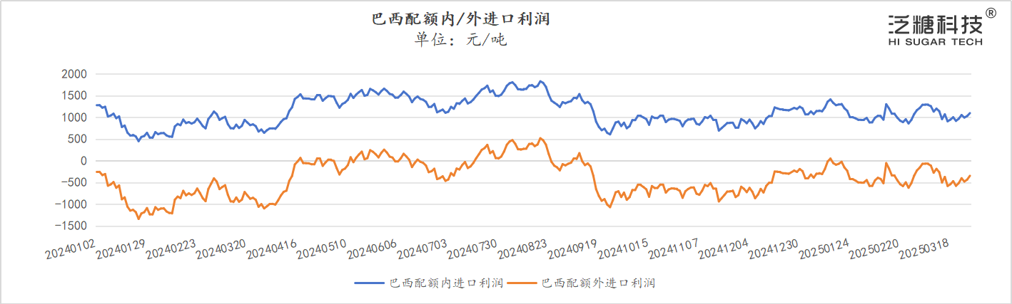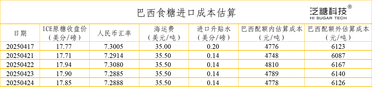 2025年4月24日,ICE原糖收盘价为17.85美分/磅,人民币汇率为7.2888。经测算,配额内巴西糖加工完税估算成本为4778元/吨,配额外巴西糖加工完税估算成本为6126元/吨;与日照白糖现货价比,配额内巴西糖加工完税估算利润为1512元/吨,配额外巴西糖加工完税估算利润为164元/吨。