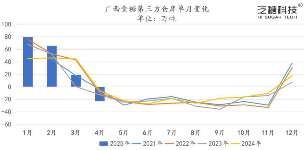 截至4月下旬,广西制糖集团提前开启清库,但第三方仓库同比持续偏高