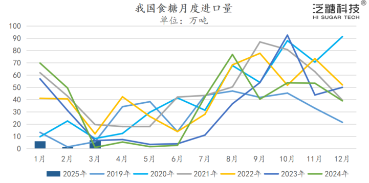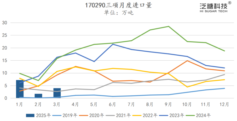 2025年3月,我国进口糖浆、白砂糖预混粉(税则号列170290)数量为4万吨,同比下降11.74万吨;其中进口甘蔗糖或甜菜糖水溶液(税则号1702.9011)1.72万吨,同比减少8.33万吨,降幅82.89%;进口甘蔗糖、甜菜糖与其他糖的简单固体混合物,蔗糖含量超过50% (税则号1702.9012)2.17万吨,同比减少2.69万吨,降幅49.81%。